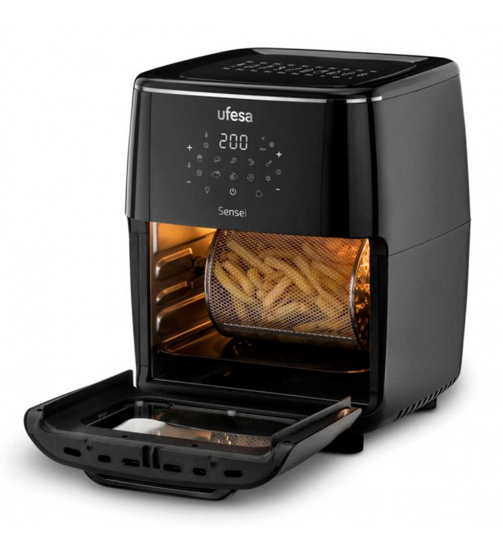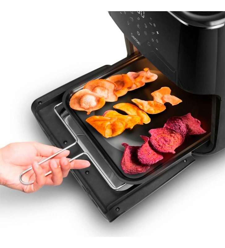 6 accesorios incluidos: 2 bandejas de horneado, bandeja de recogida de aceite, pinzas extractoras, cesta redonda giratoria de 2,9L y ganchos de asado.
