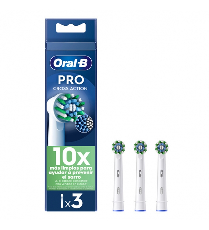 Pack 3 cabezales CrossAction para cepillo eléctrico Oral-B.Indicador de uso del cabezal.El cabezal Oral-B CrossAction cuenta con unos filamentos únicos dispuestos en un ángulo de 16º que se adaptan perfectamente a cada diente para una limpieza profunda.Elimina hasta un 100 % más de placa bacteriana para lograr unos dientes más limpios y unas encías más sanas que con un cepillo de dientes manual.
